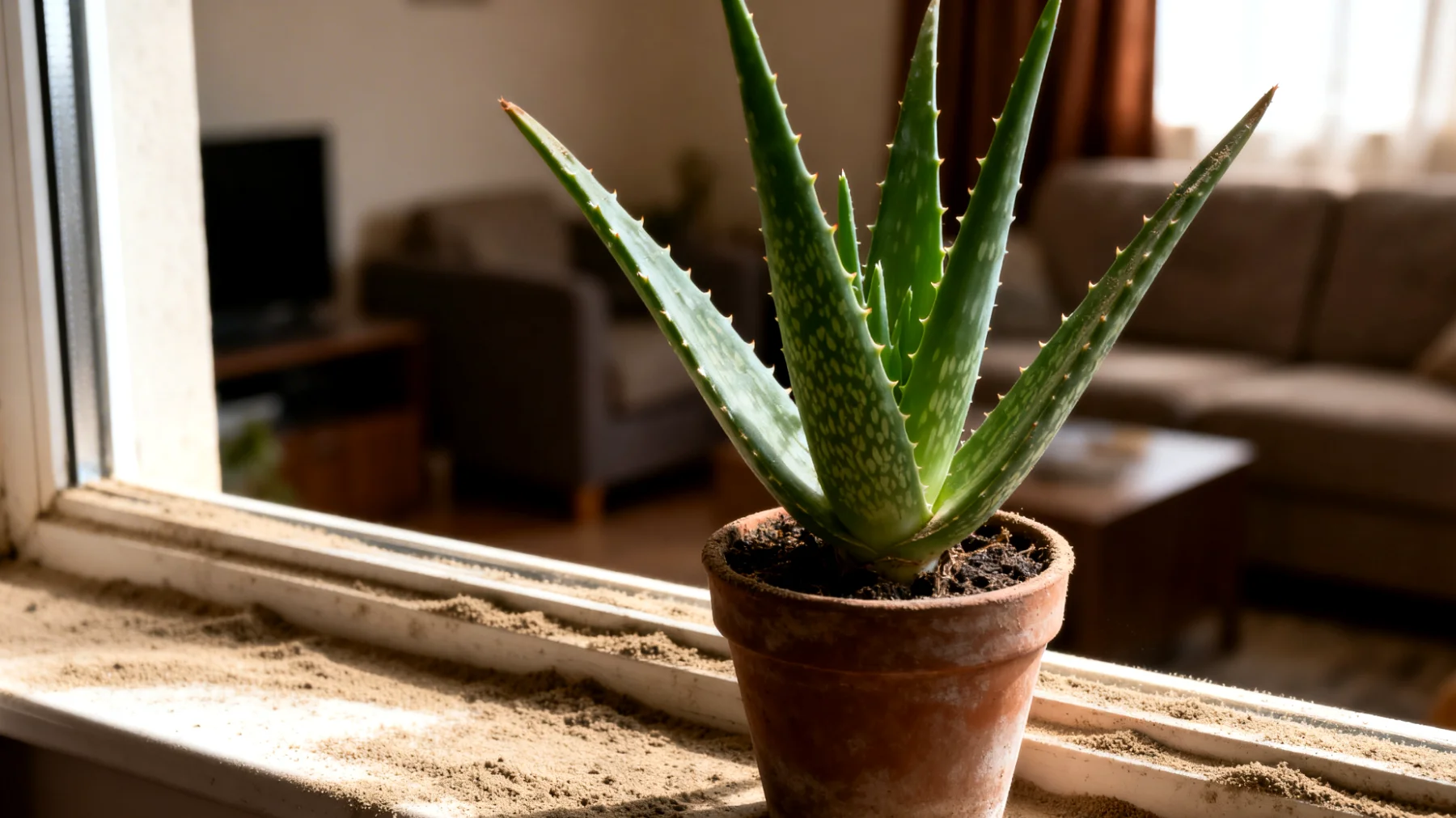 Staub besteht im Innenraum aus Hautschuppen, Textilfasern, Pollen, Rußpartikeln und winzigen Rückständen aus Koch- oder Heizprozessen. Diese Partikel setzen sich bevorzugt auf horizontalen Flächen und ebenmäßigen Pflanzenblättern ab. Die Aloe Vera ist aufgrund ihrer leicht klebrigen Wachsschicht besonders anfällig – sie zieht mikroskopisch feinen Staub an und hält ihn fest.